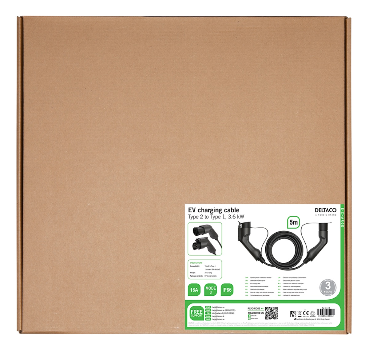 Deltaco ladekabel EV-1105 er kompatibelt med alle elbiler, der anvender et type 1 stik. Kablet er ideelt til opladning ved offentlige ladestandere eller via en ladeboks med et type 2 stik (Mode 3 opladning).