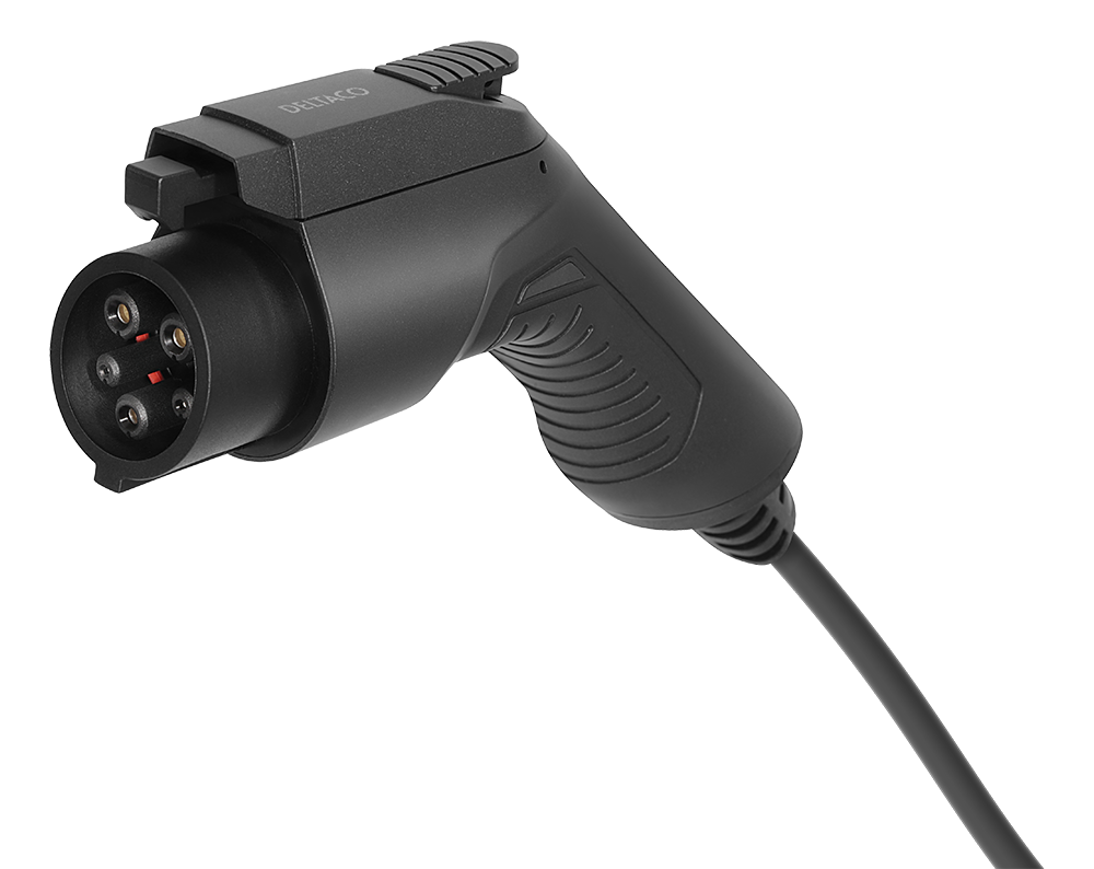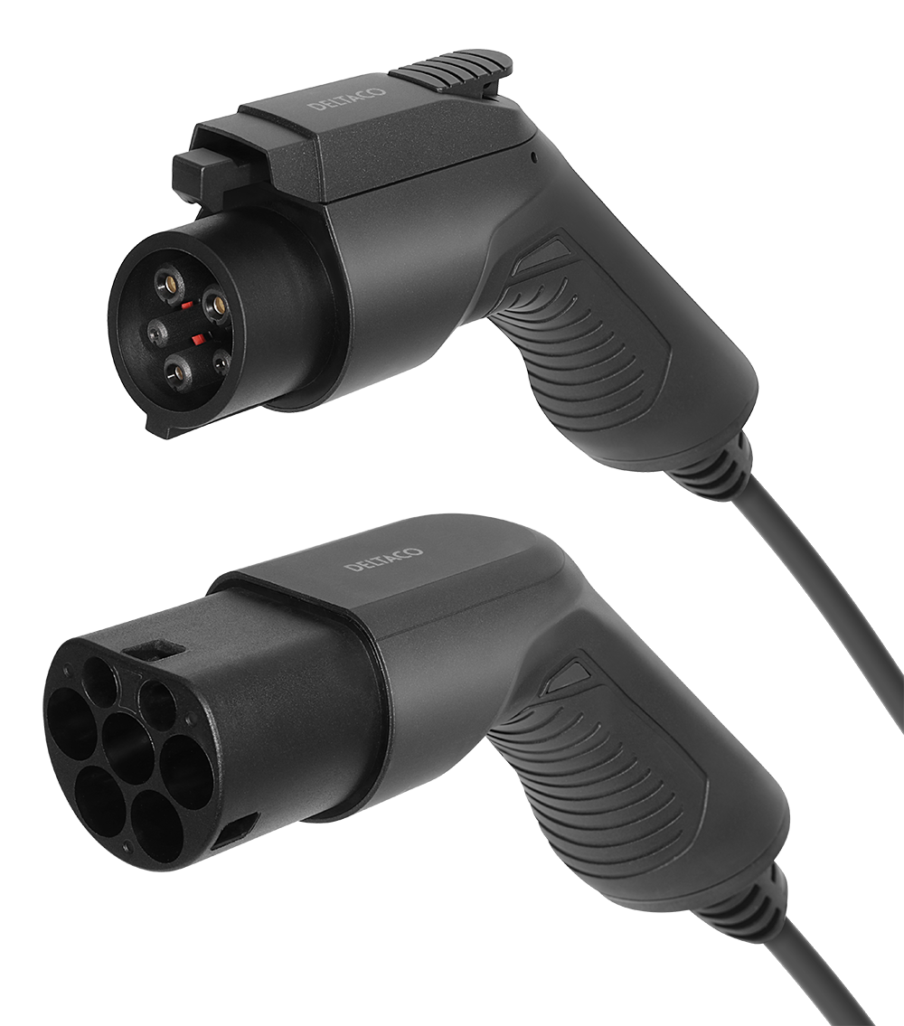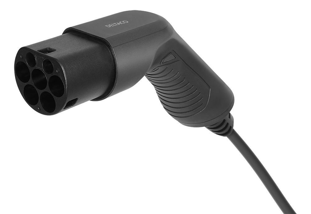 Deltaco EV-1105 ladekabel til elbiler passer til alle køretøjer med et type 1 stik og er egnet til opladning ved offentlige ladestandere eller ladebokse med type 2 stik.