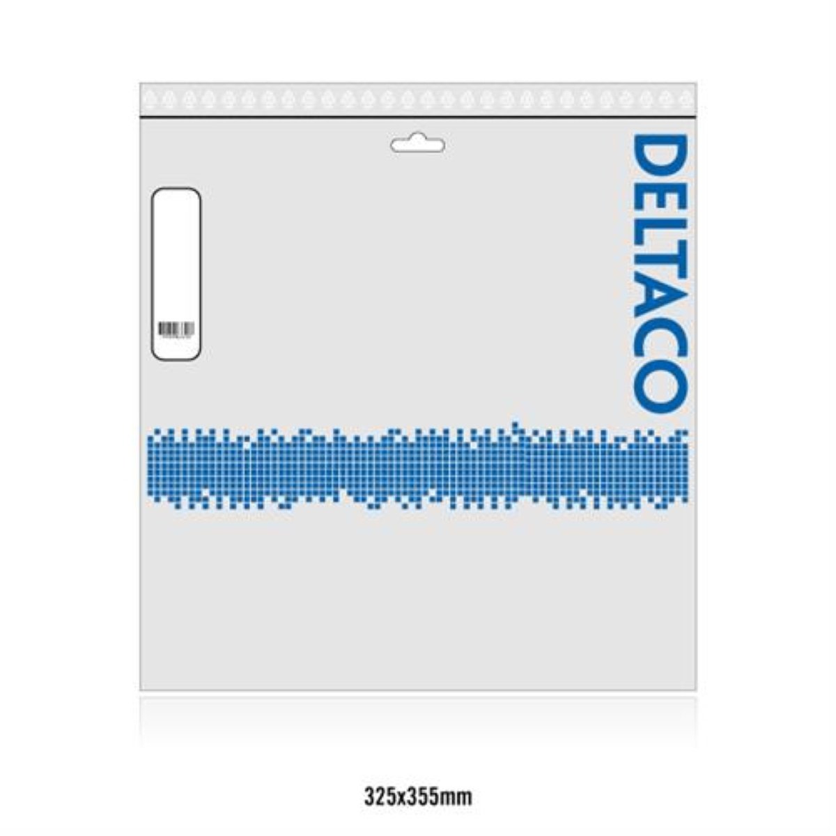 Deltaco U/UTP Cat6a patch kabel på 50 meter i grå. Begge ender har stik med grå plasthætte og gennemsigtig RJ45-kontakt.Deltaco emballage til patchkabel, grå med blå pixelmønster og logo. Mål 325x355mm.