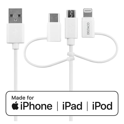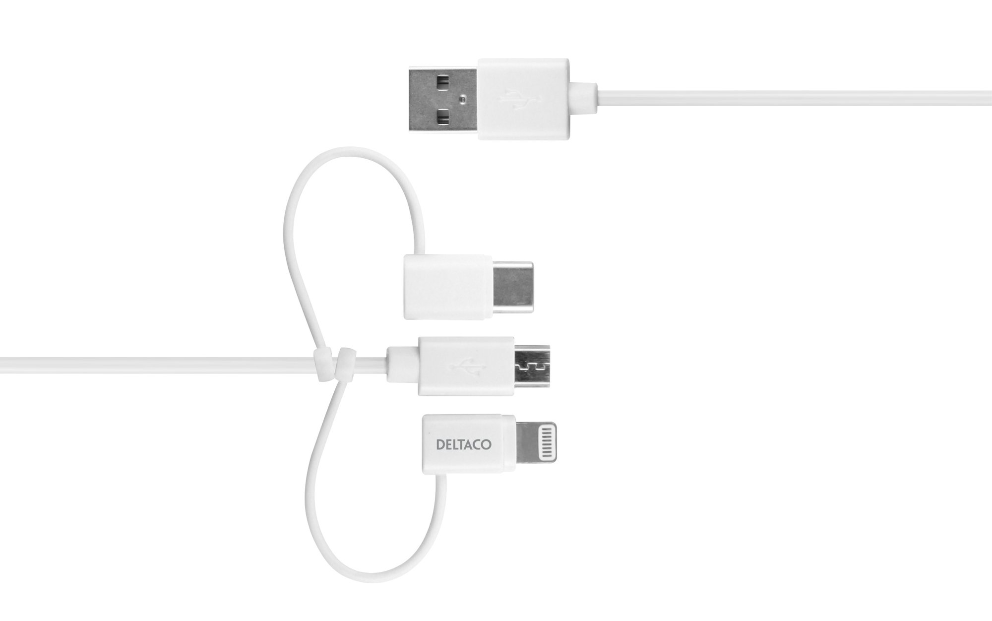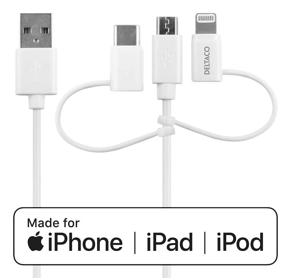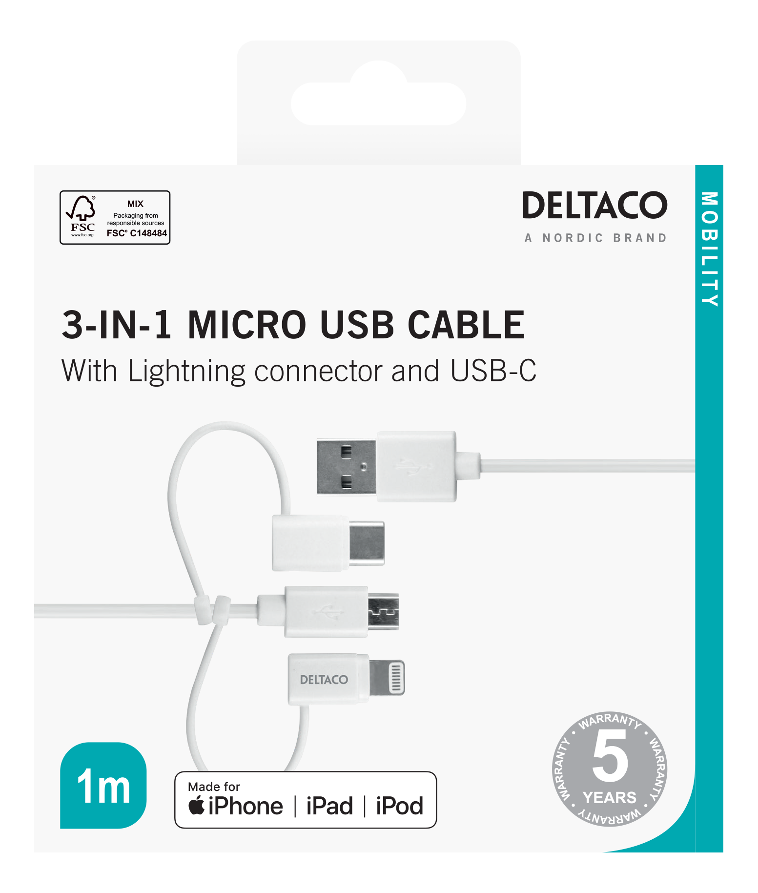 Dette 3-i-1 Usb-kabel fra Deltaco giver dig mulighed for at synkronisere eller oplade de fleste mobile enheder på markedet. Kablet er udstyret med Usb-C, Micro Usb og Lightning-stik, hvilket gør det alsidigt og praktisk.