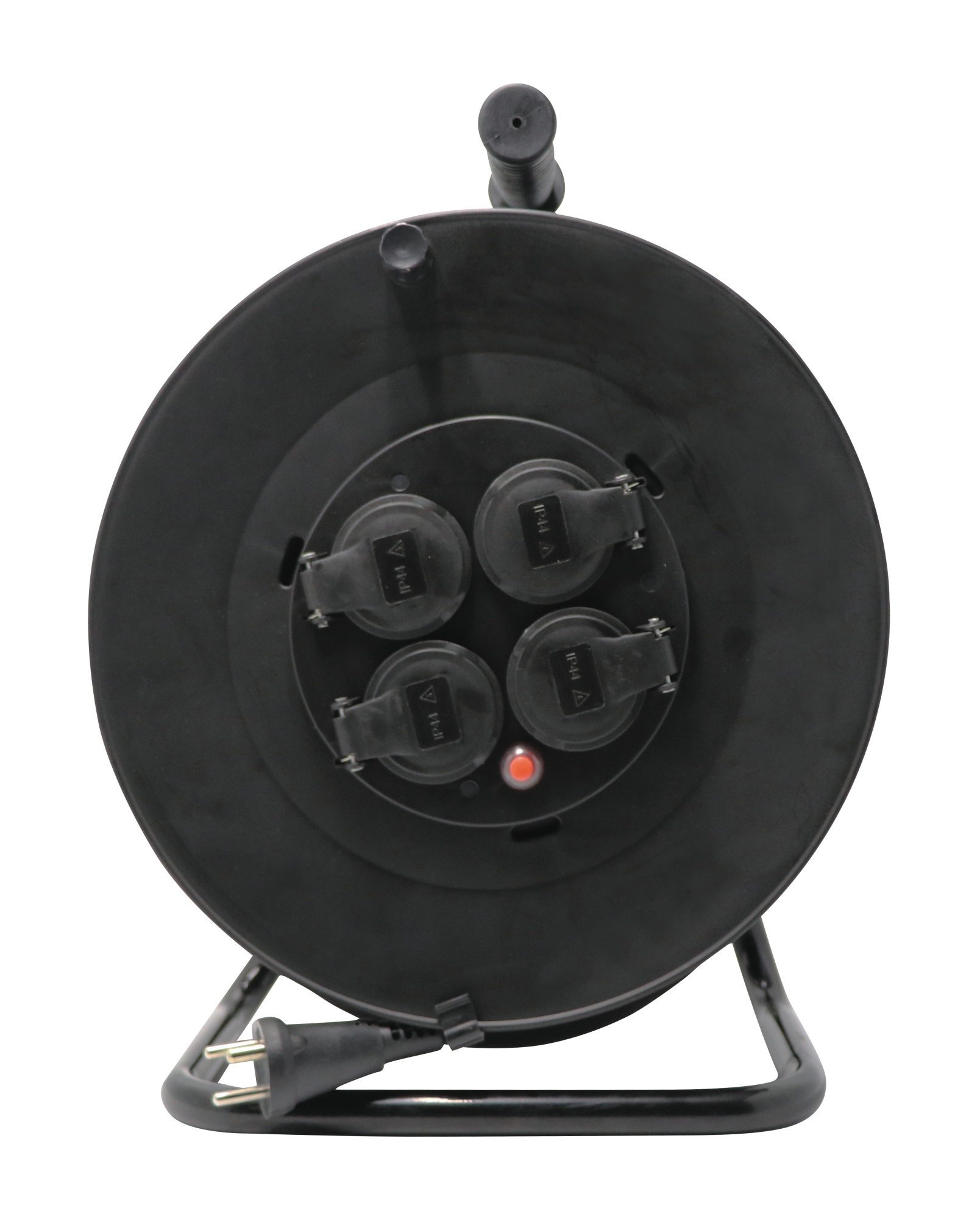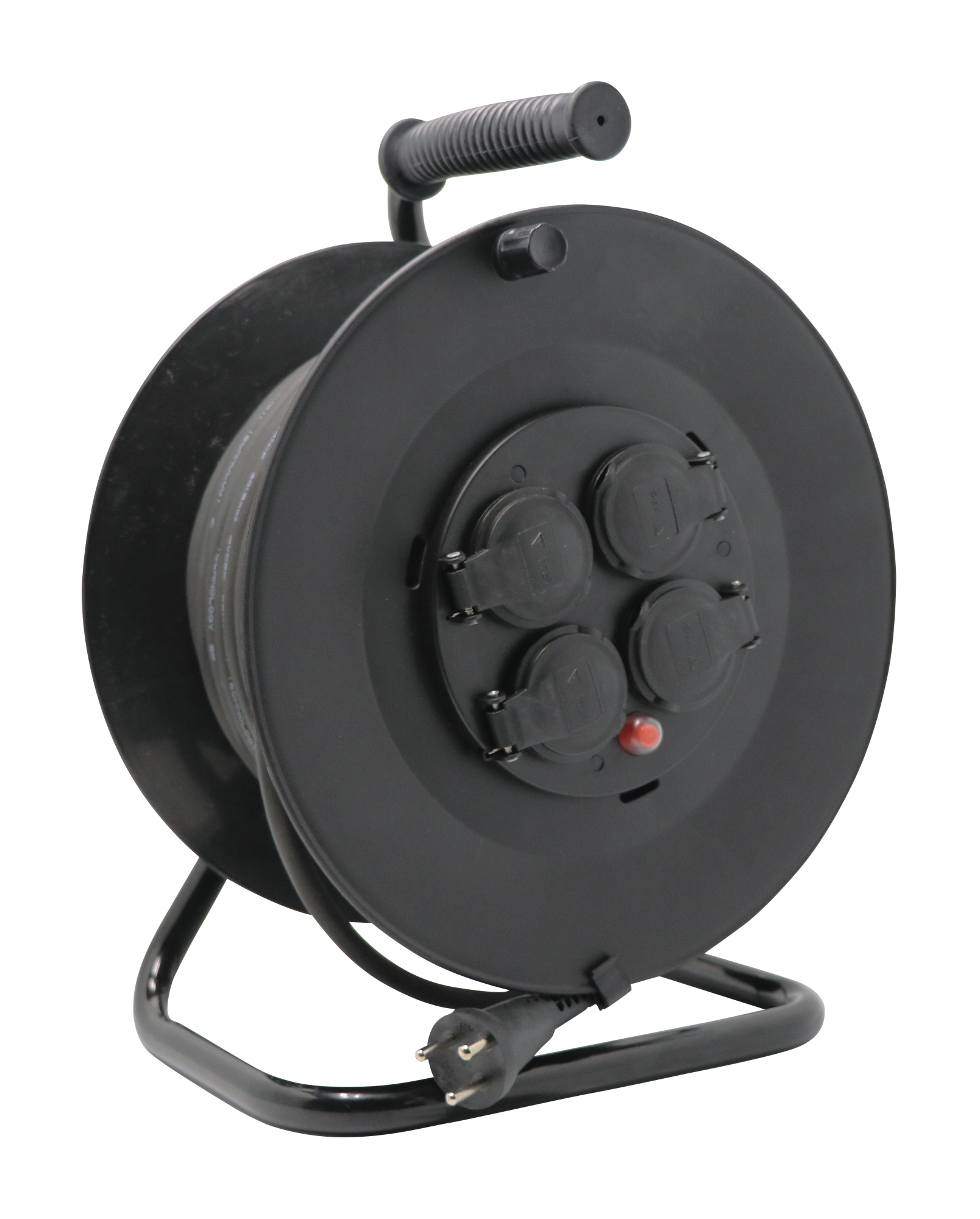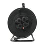 Kabeltromle med ergonomisk håndtag, praktisk oprulningsfunktion, fire danske stik med termisk afbryder og børnesikring.