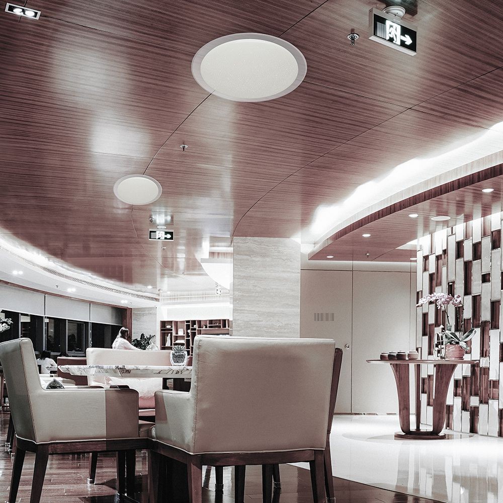 Elegant LED loftlampe med CCT-skift og dæmpning via fjernbetjening. Leverer 7200 lumen med et forbrug på 72W og har et unikt stjernecover.