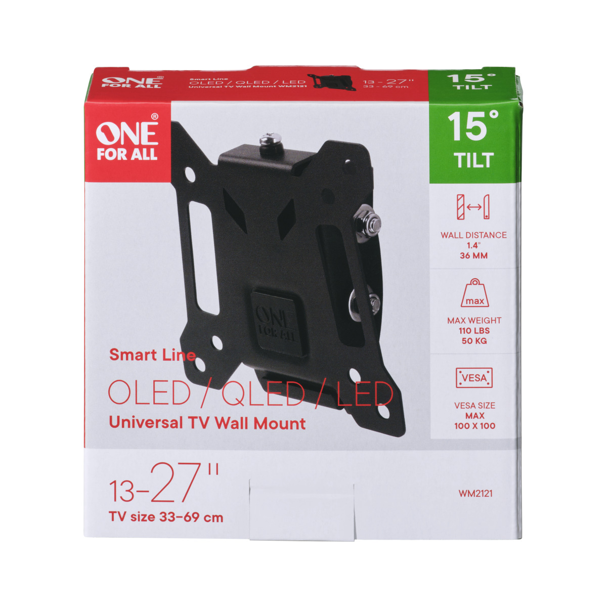 One For All WM2121 TV-beslaget er designet til at give dig en fleksibel og optimal synsoplevelse. Med en hældningsjustering på op til 15° frem eller tilbage kan du nemt modvirke uønskede refleksioner fra sollys eller indendørs belysning, hvilket sikrer en klar og behagelig visning fra enhver position i rummet.