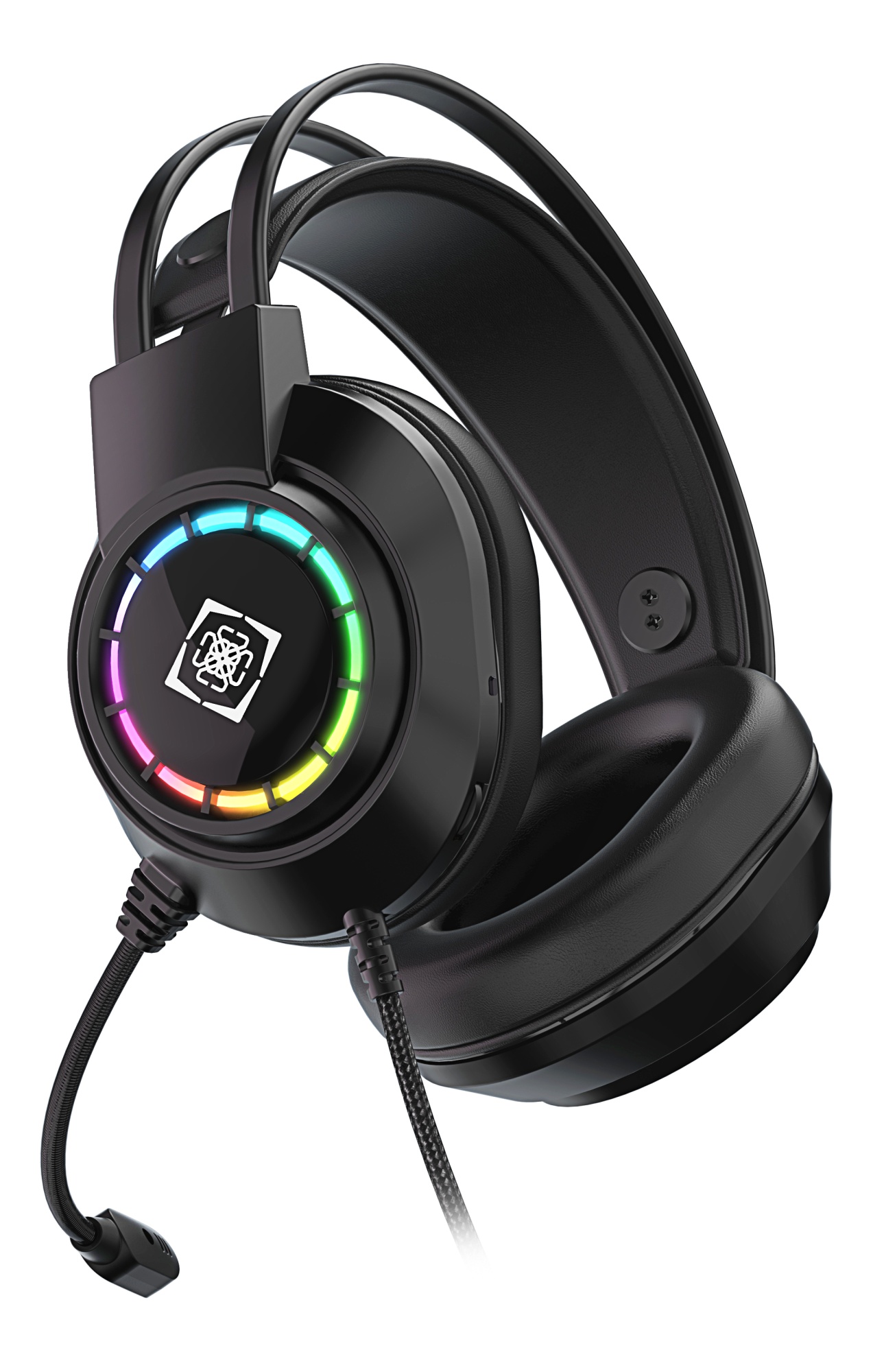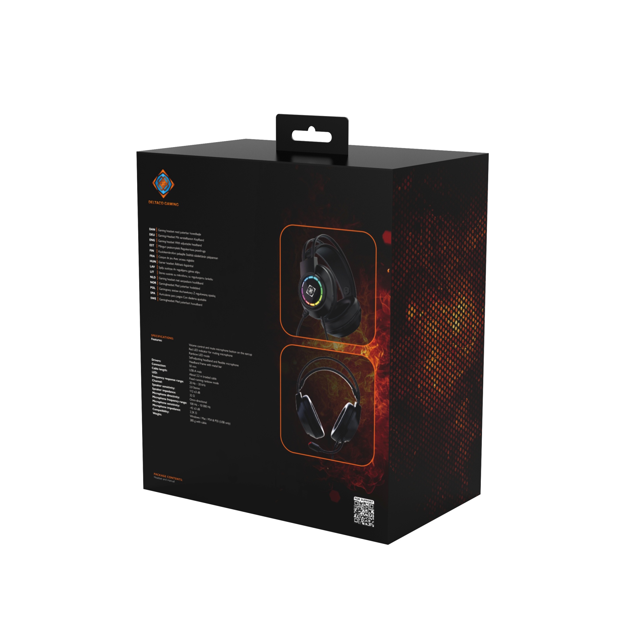 Deltaco DH220 gaming headset med intuitive knapper, regnbue-LED, justerbar hovedbøjle og fleksibel mikrofon. Letvægt og holdbar med 50 mm drivere.