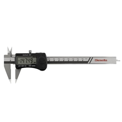 Digital skydelære med spidse kæber. Måler fra 0-150 mm med 0,01 mm aflæsning og kæbelængde på 40 mm. Manuel on/off, nulstilling, omskifter fra mm til tommer, fladt dybdemål.