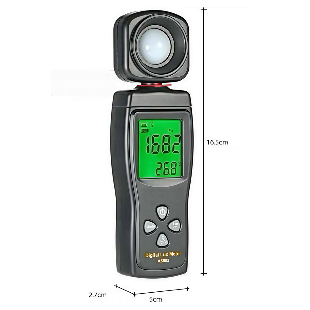 Denne digitale luxmåler giver præcise målinger af lysintensitet. Med en højde på 165 mm og bredde på 50 mm er den nem at håndtere.