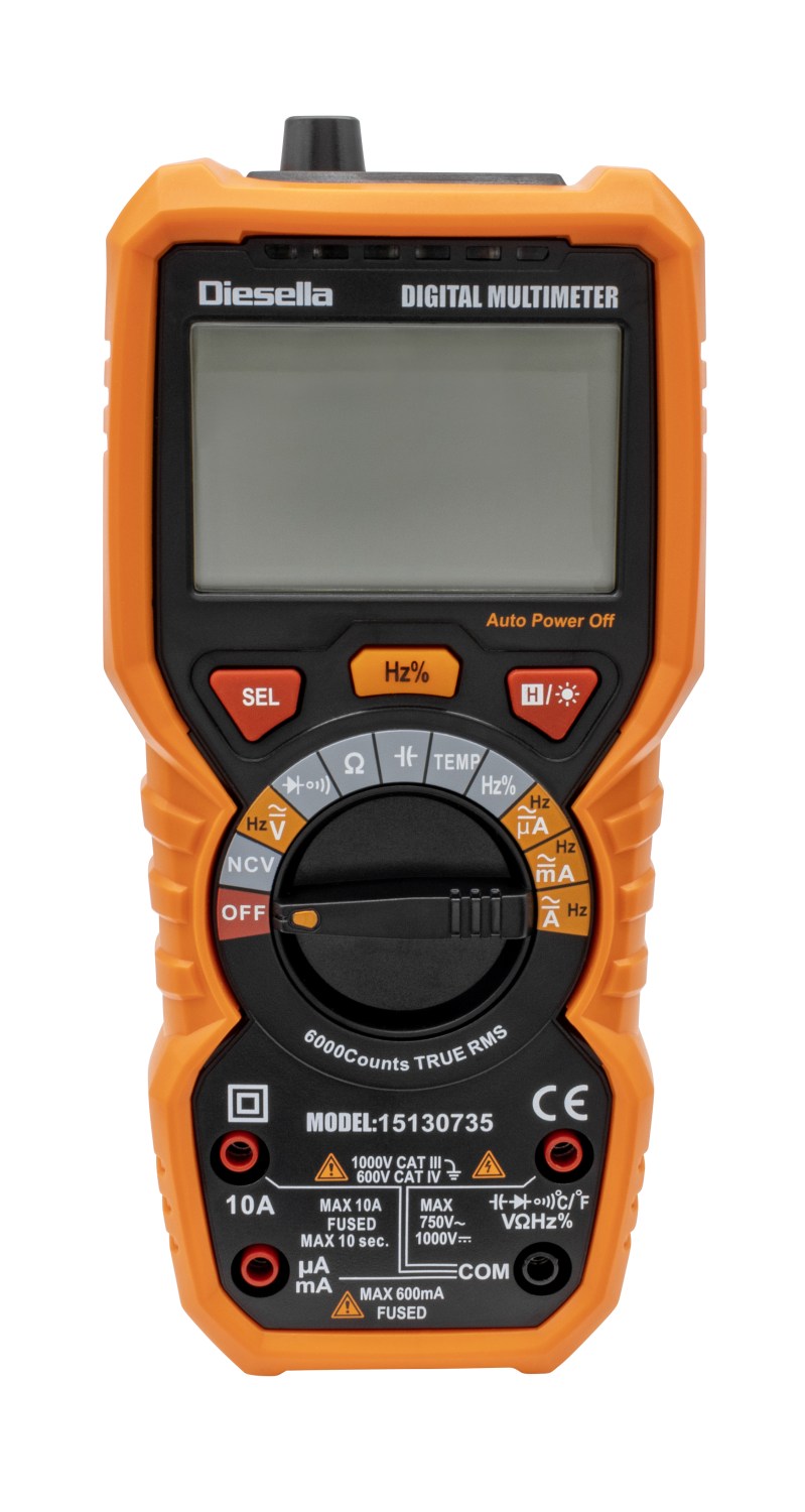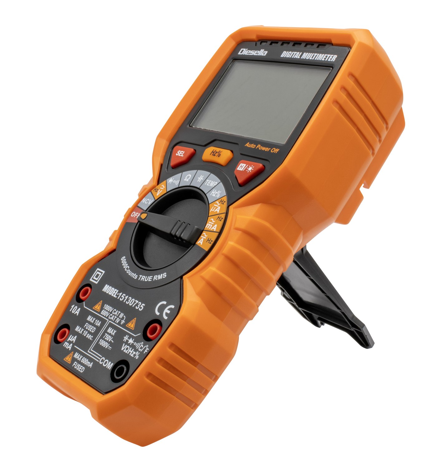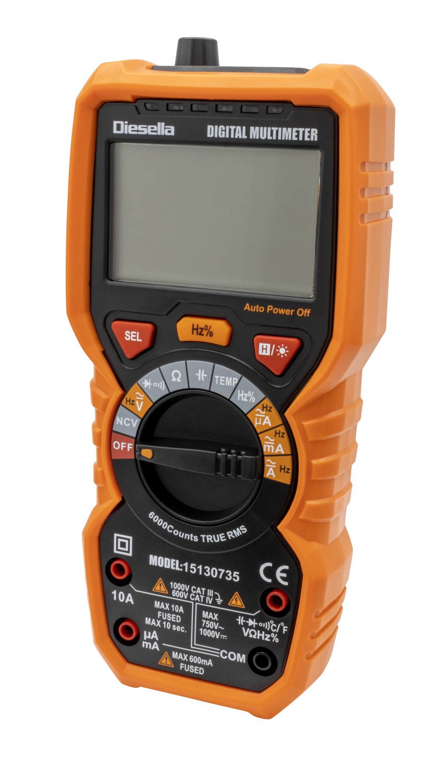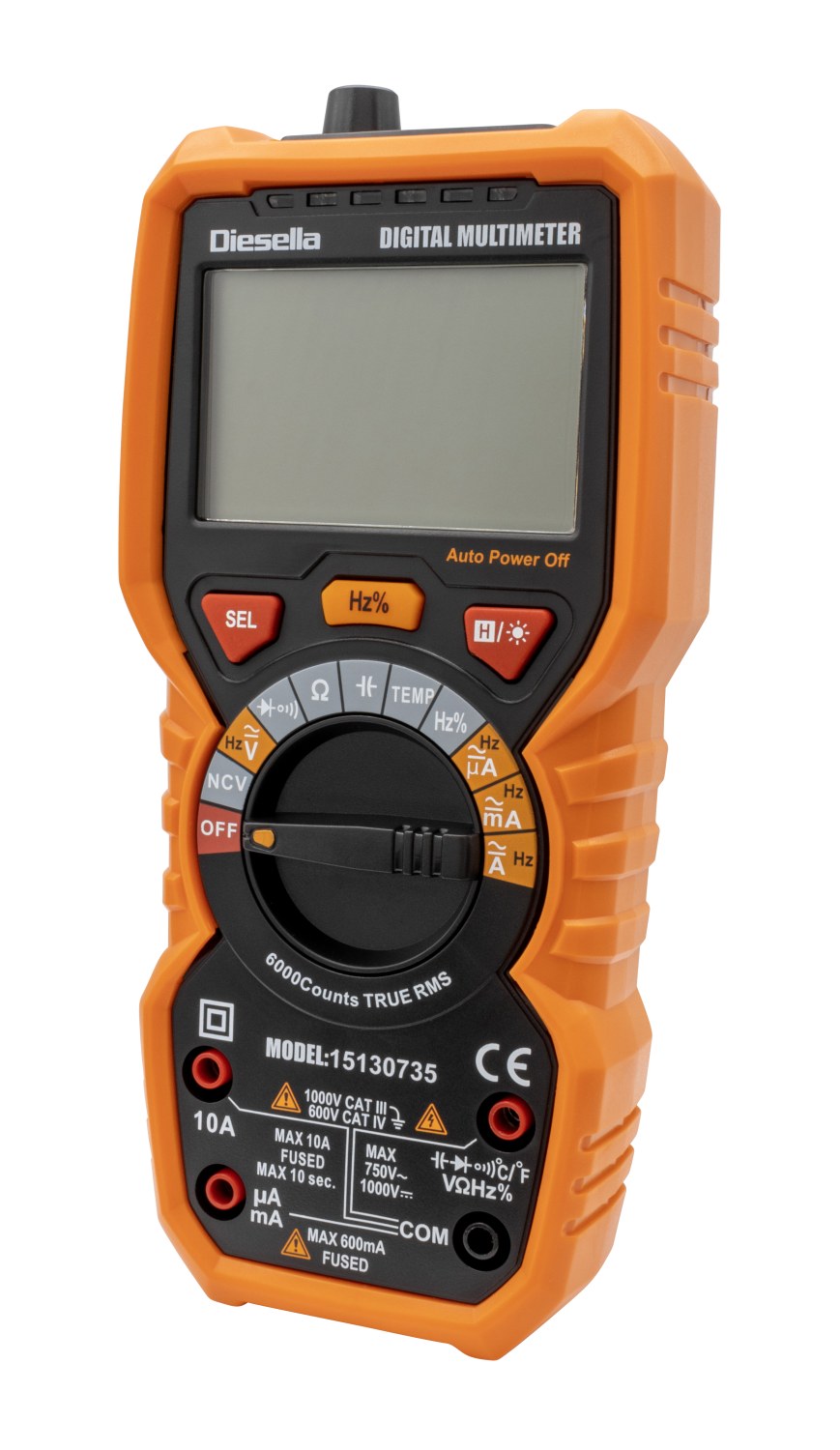 Digital multimeter med Sand RMS, 1000V/10A og gummikappe fra Diesella.