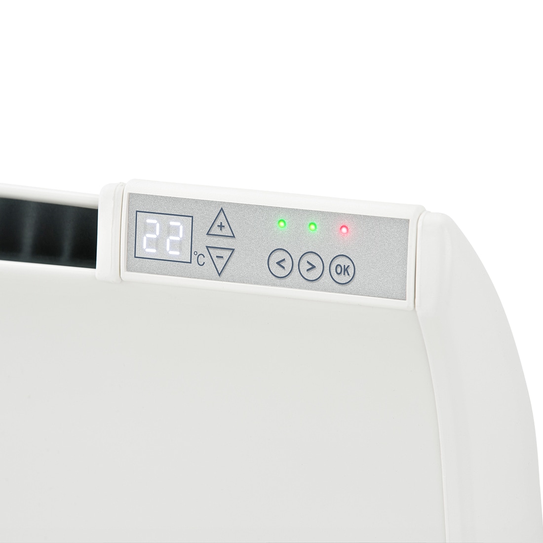 Digital elektronisk termostat som automatisk sænker temperaturen om natten, og om dagen hvis boligen ikke bruges i dagtimerne. Valgt temperatur vises med lysende letlæsige tal.