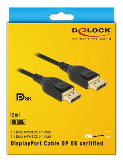Dette certificerede DisplayPort kabel fra Delock forbinder enheder med DisplayPort interface til PC eller laptop. Understøtter 8K Ultra HD (7680 x 4320 @ 60 Hz) og forbedrer lydkvaliteten.