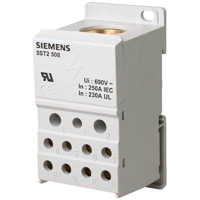Siemens fordelingsblok, 1-polet, 250 A, 690V. Til montage på standard monteringsskinne. Indgang: 1x 35-120 mm². Udgang: 2x2,5-25+5x 2,5-16+4x 2,5-10 mm².