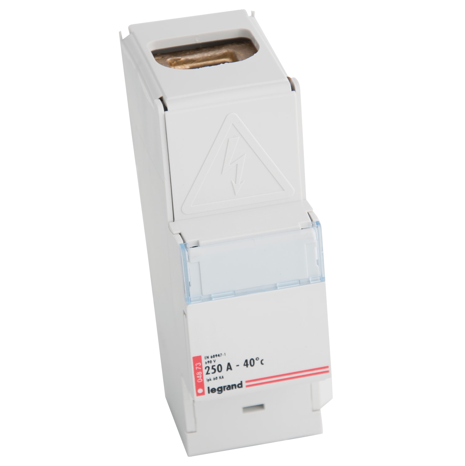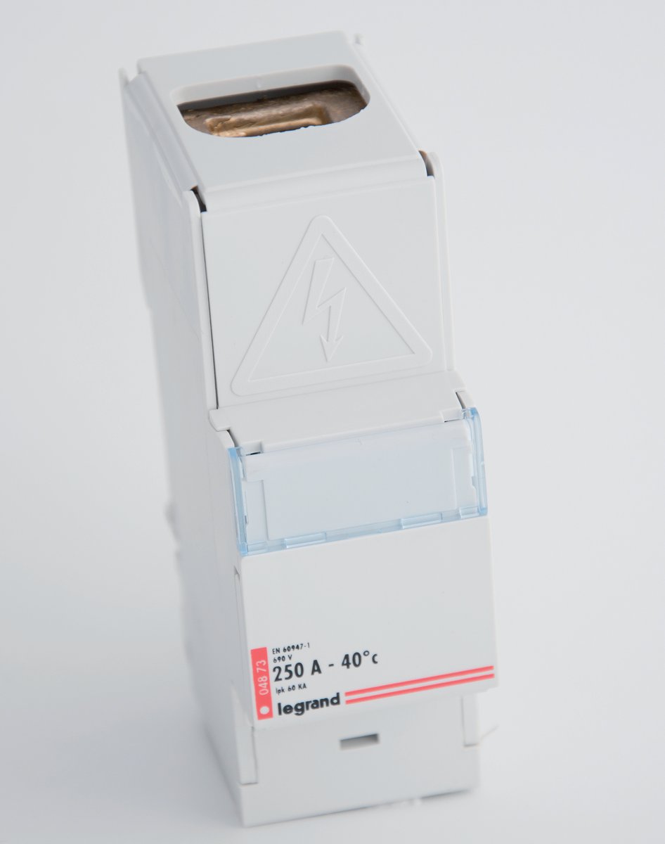 Legrand modulare fordelingsklemmer til DIN-skinne. Med labelholder og mulighed for sammensætning. Kan udvides til fire-polet. Rating: 250 A. Isc peak: 60 kA. Antal moduler: 2.