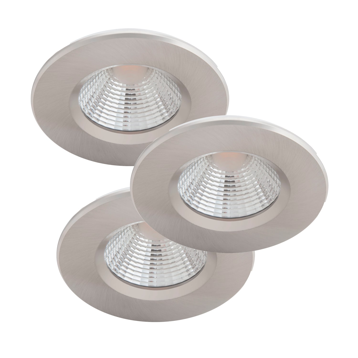 Praktisk 3-pak med Dive indbygningsspots i mat krom. 5W LED, 2700K varm hvidt lys, IP65-klassificeret og dæmpbar.