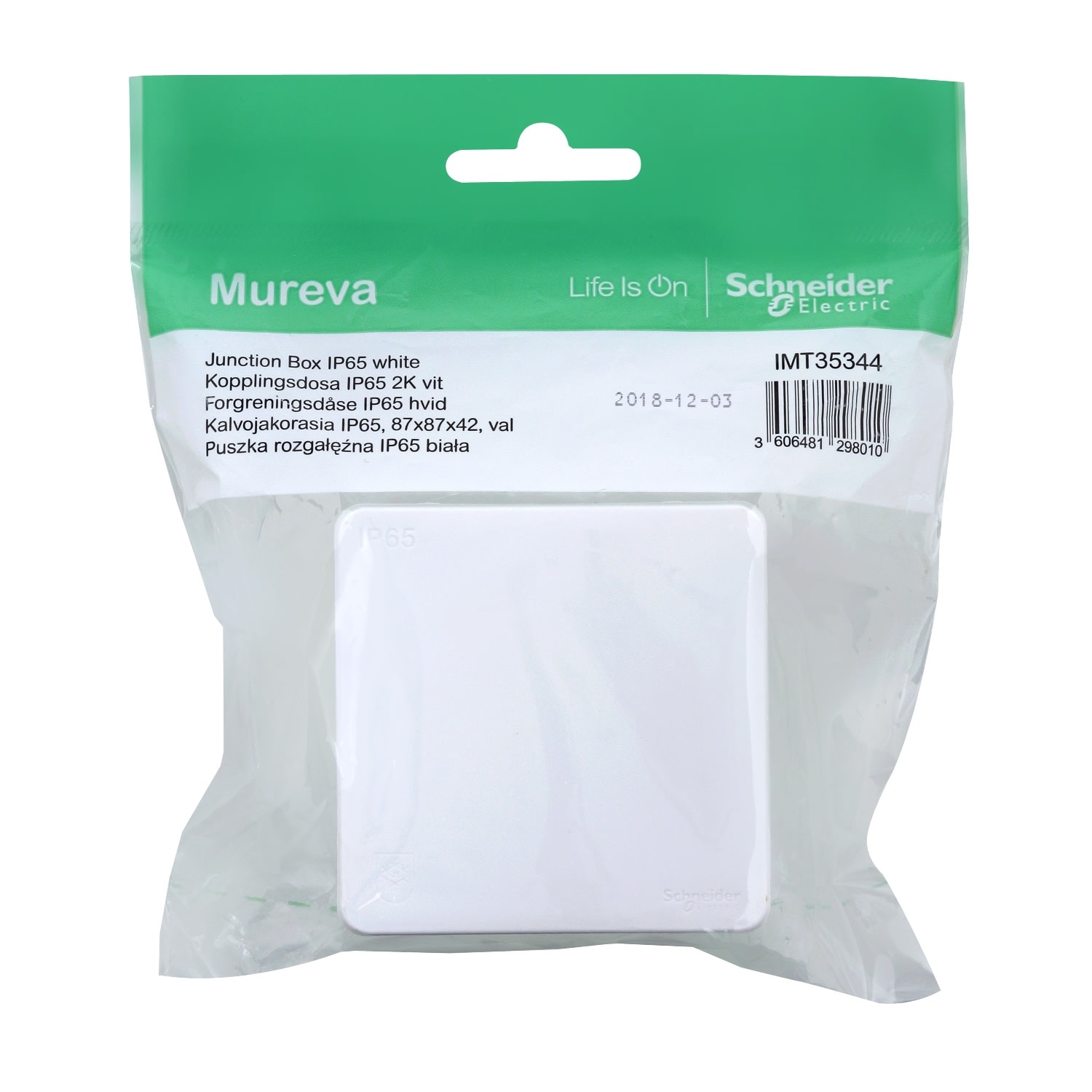 Hvid Mureva forgreningsdåse IP65, der er 'koldt klima'-kompatibel og kan bruges ved temperaturer ned til -25 °C. Mål: 87 x 87 x 42 mm.