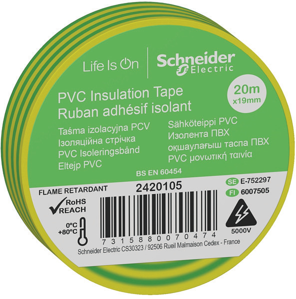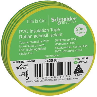 Fleksibel PVC-tape fra Schneider Electric til isolering, mærkning og beskyttelse af kabler og rør. Ideel til VVS-arbejde, tætning og bundtning.