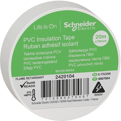 Hvid PVC-tape fra Schneider Electric, ideel til elektrisk isolering, mærkning, beskyttelse af rør og kabel, tætning og VVS-arbejde.