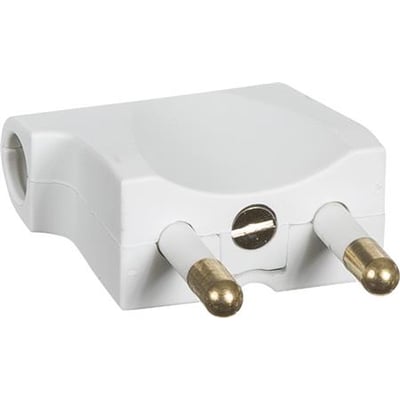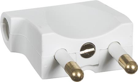 Hanstik 250V flad, vinkel, uden jord. Anvendes til montage på ledning og passer til runde hunstik. Med isolerede stikben.