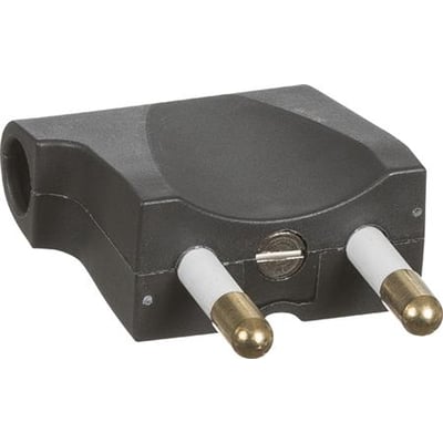 Vinklet hanstik 250V flad, uden jord. Til montage på ledning, passer til runde hunstik. Med labyrintaflastning.