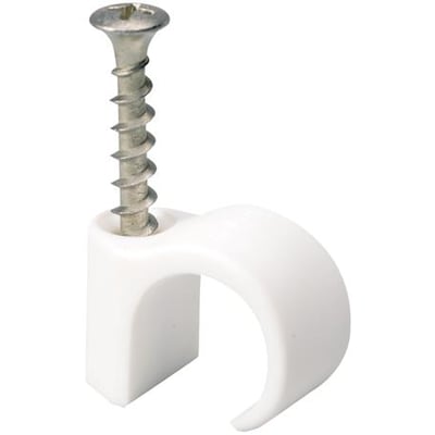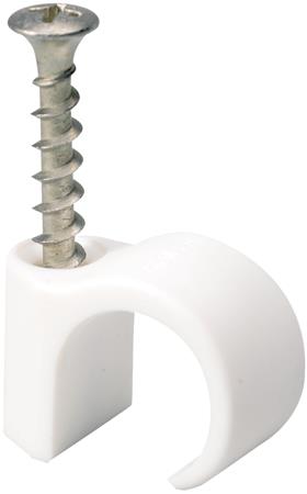 Skrueclips med diameter 10-14 mm. Materiale: Stål, gulkromat (THE), galvaniseret skrue. Hvid farve og skruemontering.