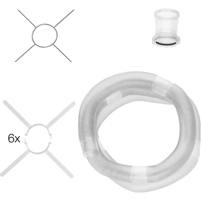 Pakke til fleksibelt DN110 aftræk - 15 m. Indeholder: fleksibelt DN110 rør - 15 m, samlemuffe, 6 stk. afstandsholdere samt bærestykke til skorsten.
