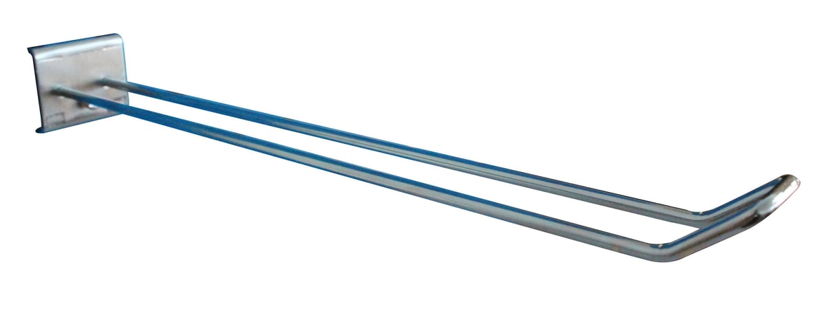 Dobbelt varekrog, 300 mm lang og med en krogdiameter på Ø4 mm. Designet med firkantet snude og dobbelt bagplade. Passer til hulplader med 9 x 9 mm firkantede huller.