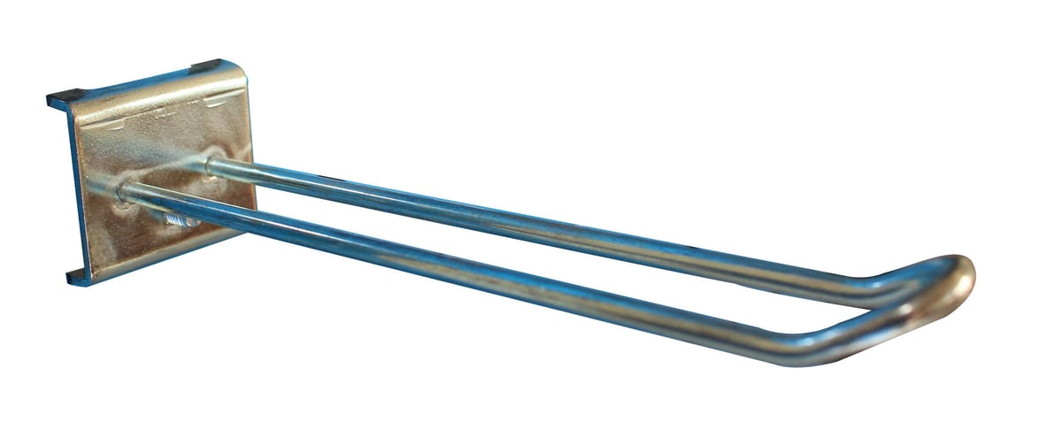 Dobbelt varekrog, 150 mm lang og med en diameter på Ø4 mm. Designet med dobbelt bagplade og passer til hulplader med firkantede huller (9 x 9 mm) og en centerafstand på 34 mm og 38 mm.