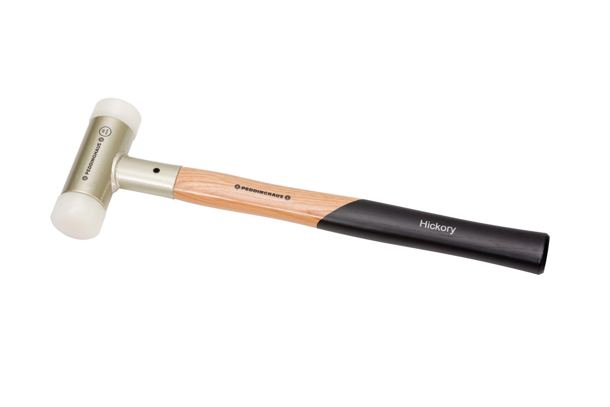 Hammeren er udstyret med udskiftelige baner af holdbart nylon, som sikrer en skånsom, men effektiv slagkraft. Skaftet er fremstillet af lakeret hickory, kendt for sin styrke og holdbarhed, hvilket bidrager til hammerens lange levetid og komfortable håndtering.