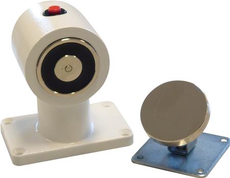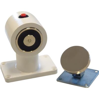 Dørholdemagnet, styrke 55kg, magnet Ø50mm, 24Vdc, 60mA, gulvmontering, med udløsertryk, hvid, inkl. anker.