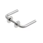 Dørgreb L-form Ø18 mm i matbørstet rustfrit stål (AISI 304) med massive rosetter (2 mm) og dørgrebspind 8x8 mm. Leveres som sæt med patentskruer, løse bøsninger, Randi Plug og træskruer.