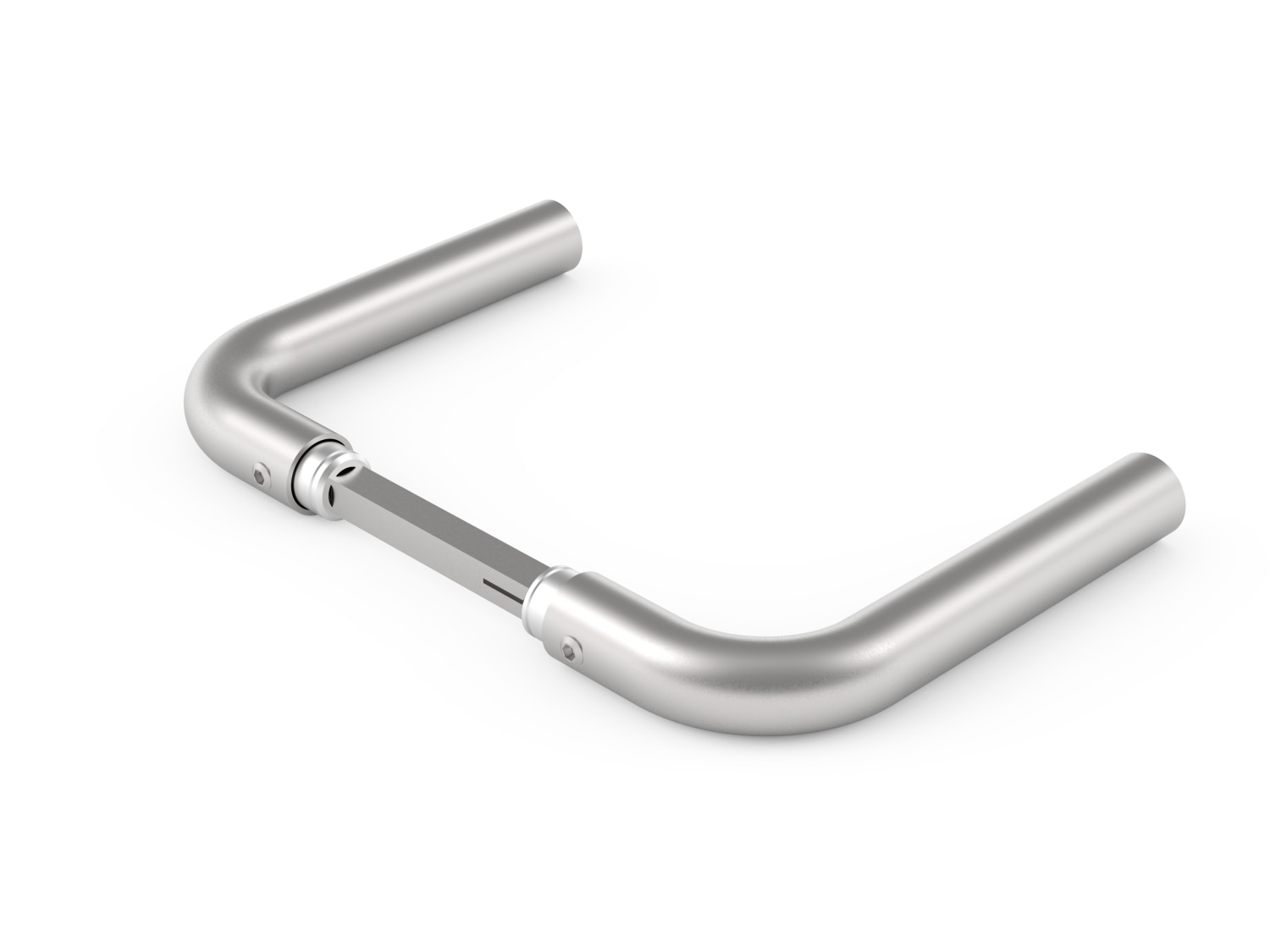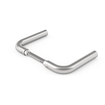 Dørgreb L-form ø18 mm i matbørstet rustfrit stål (AISI 304). Leveres uden rosetter til montage på langskilt. Passer til dørtykkelser på 65-89 mm.