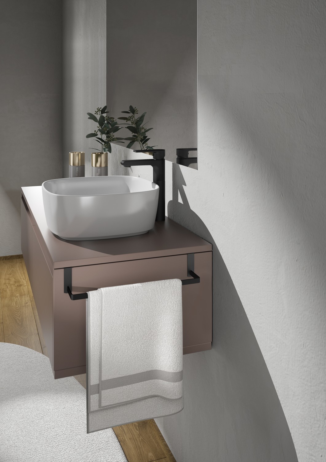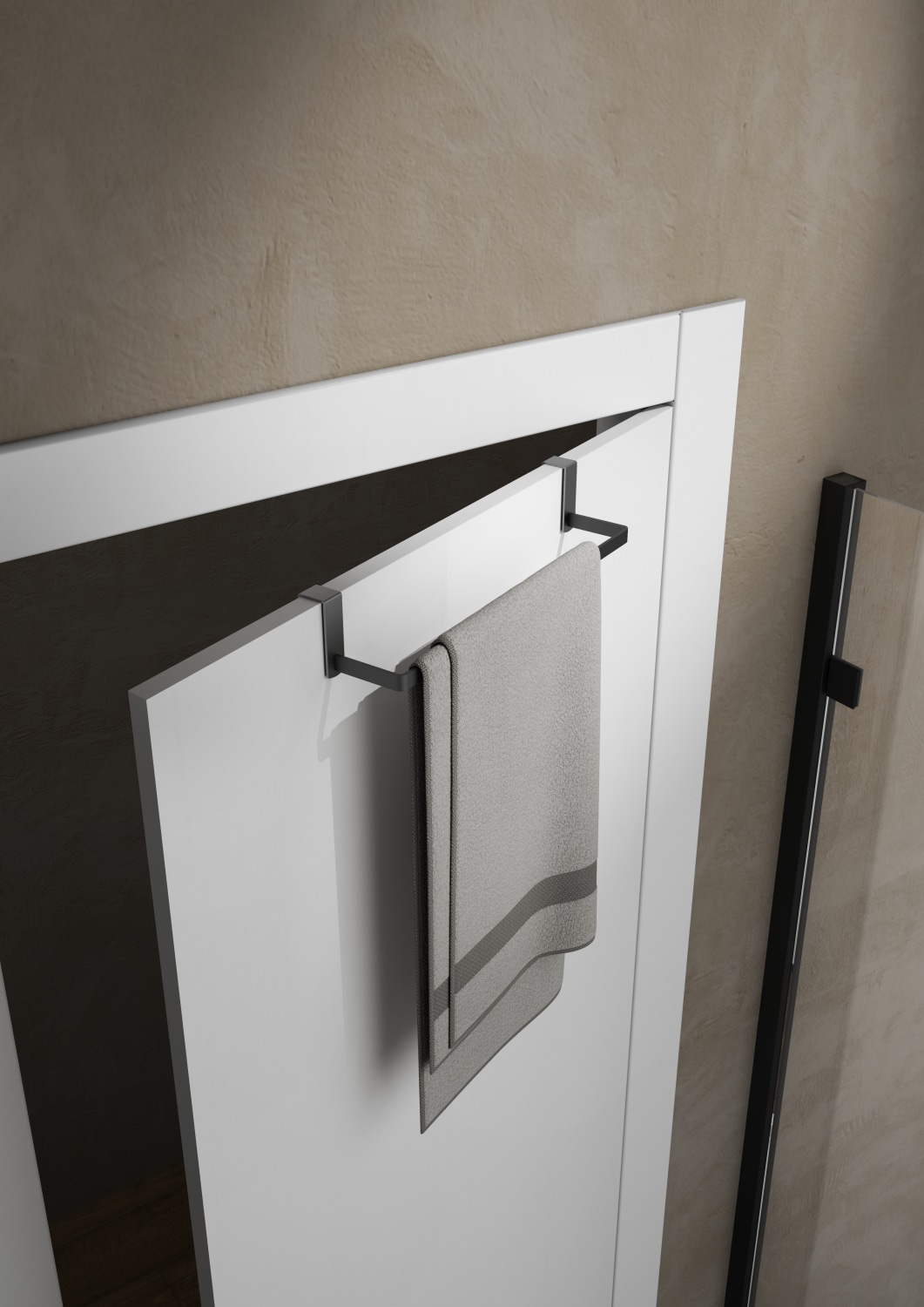 Praktisk håndklædeholder til ophæng på dør. Mål: 300 x 47 x 45 mm. Farve: mat sort.