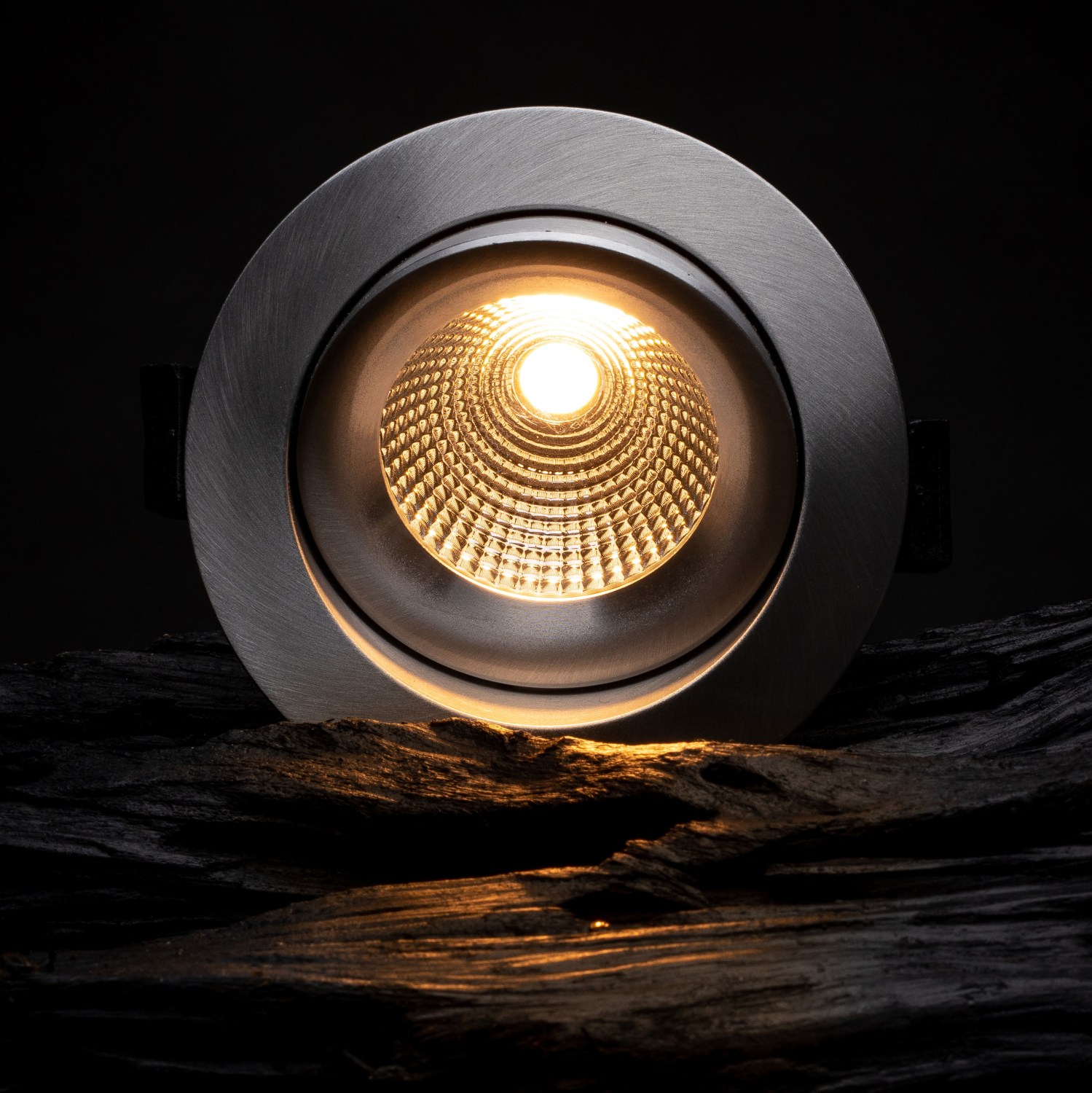 Downlighten leveres komplet med en dæmpbar driver, der giver mulighed for at justere lysstyrken efter behov. Med en lav indbygningshøjde på kun 46mm er den velegnet til lofter med begrænset plads. Den kan vippes 30° i alle retninger (360°), hvilket gør den ideel til at fremhæve specifikke områder eller objekter.