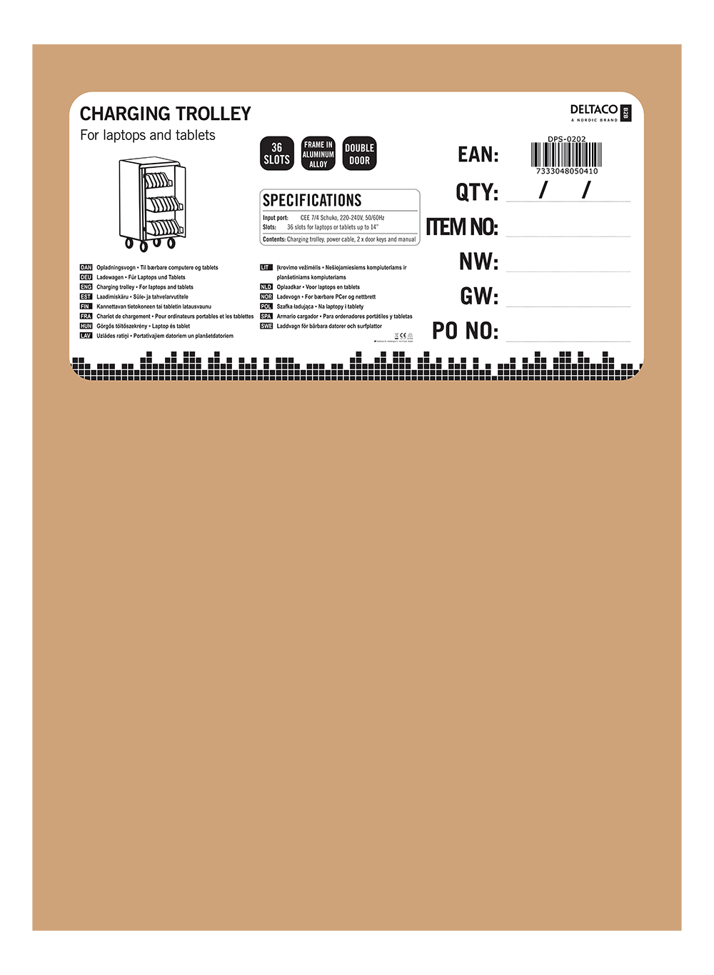 Denne mobile opladningsvogn fra Deltaco er designet til sikker opbevaring og effektiv opladning af op til 36 bærbare computere eller tablets med en størrelse på op til 14 tommer.