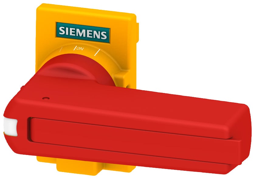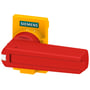 Tilbehør til 3KD størrelse 2. Direkte betjeningsmekanisme, til frontbetjeningsmekanisme, rød/gul. Standardversion kan låses i OFF position med tre hængelåse.