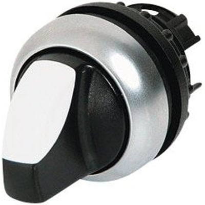 Dette drejegreb fra Eaton er designet til M22 trykknapserien. Det har 2 faste positioner og en kort knebel i sort med hvid markering og alufarvet bundring.