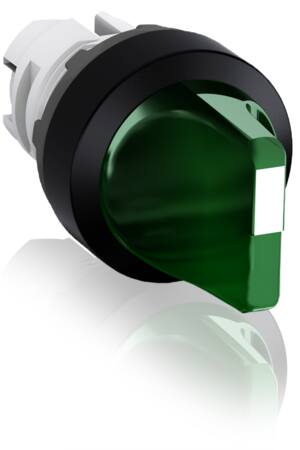 Dette drejegreb fra ABB er udstyret med et Ø22 mm trykknapshoved, en grøn lampe og et kort greb. Det har to stillinger.