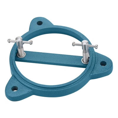 Drejeskive med monteringshuller og skruer for sikker fastgørelse af skruestikken til arbejdsbord eller anden overflade.
