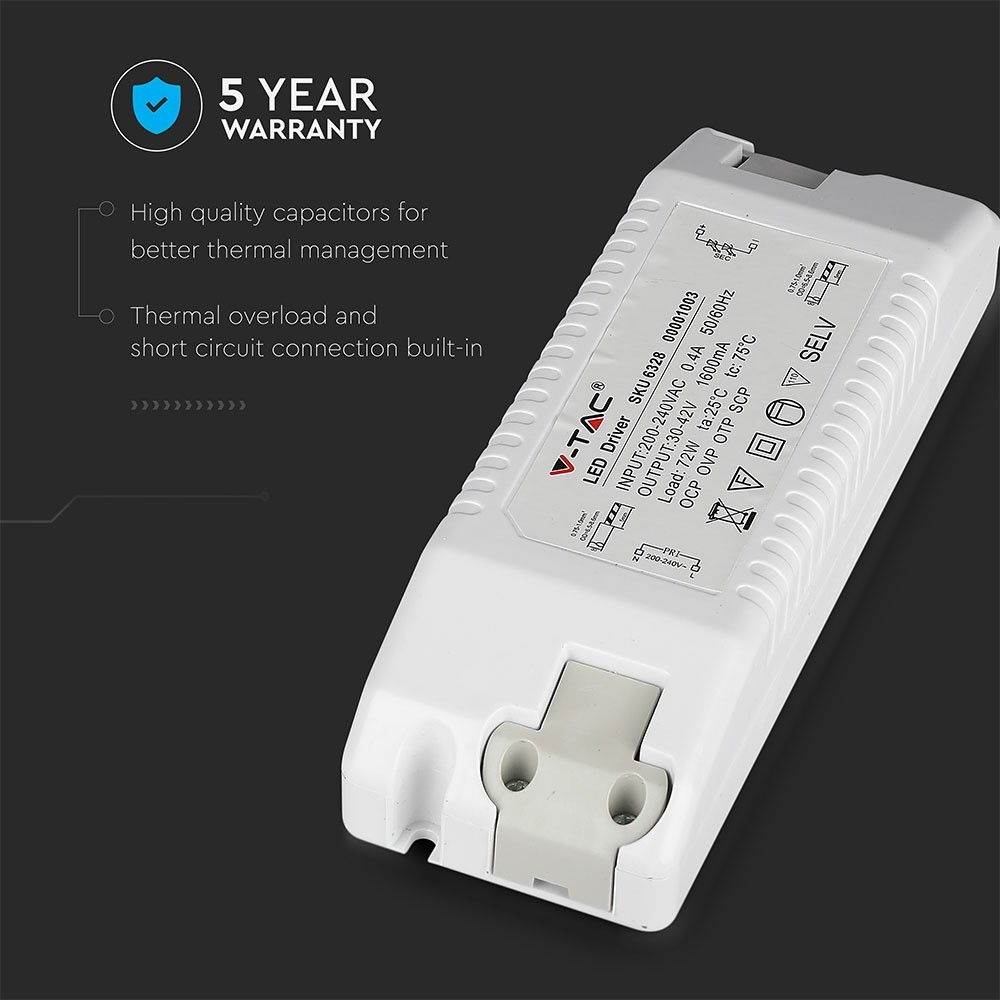 Denne 72W LED driver er designet til at forsyne LED paneler med en konstant strøm på 1600mA. Med en justerbar udgangsspænding på 30-42V sikrer den optimal drift for dine LED-armaturer.