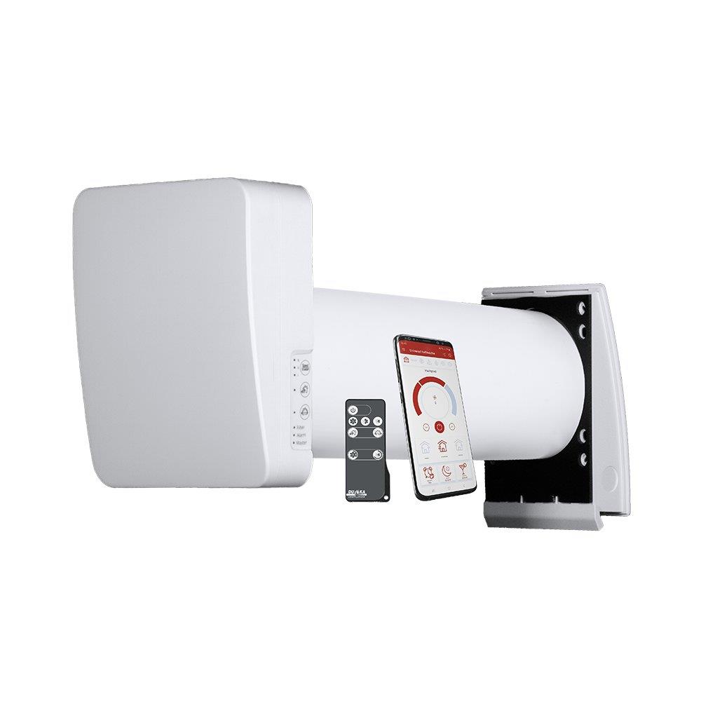 Duka One S6 Wi-Fi er en innovativ et-rums ventilationsløsning, der effektivt genvinder varmen fra udsugningsluften. Denne model monteres direkte i ydervæggen, hvilket gør den ideel til at løse ventilationsbehov i specifikke rum i boligen.