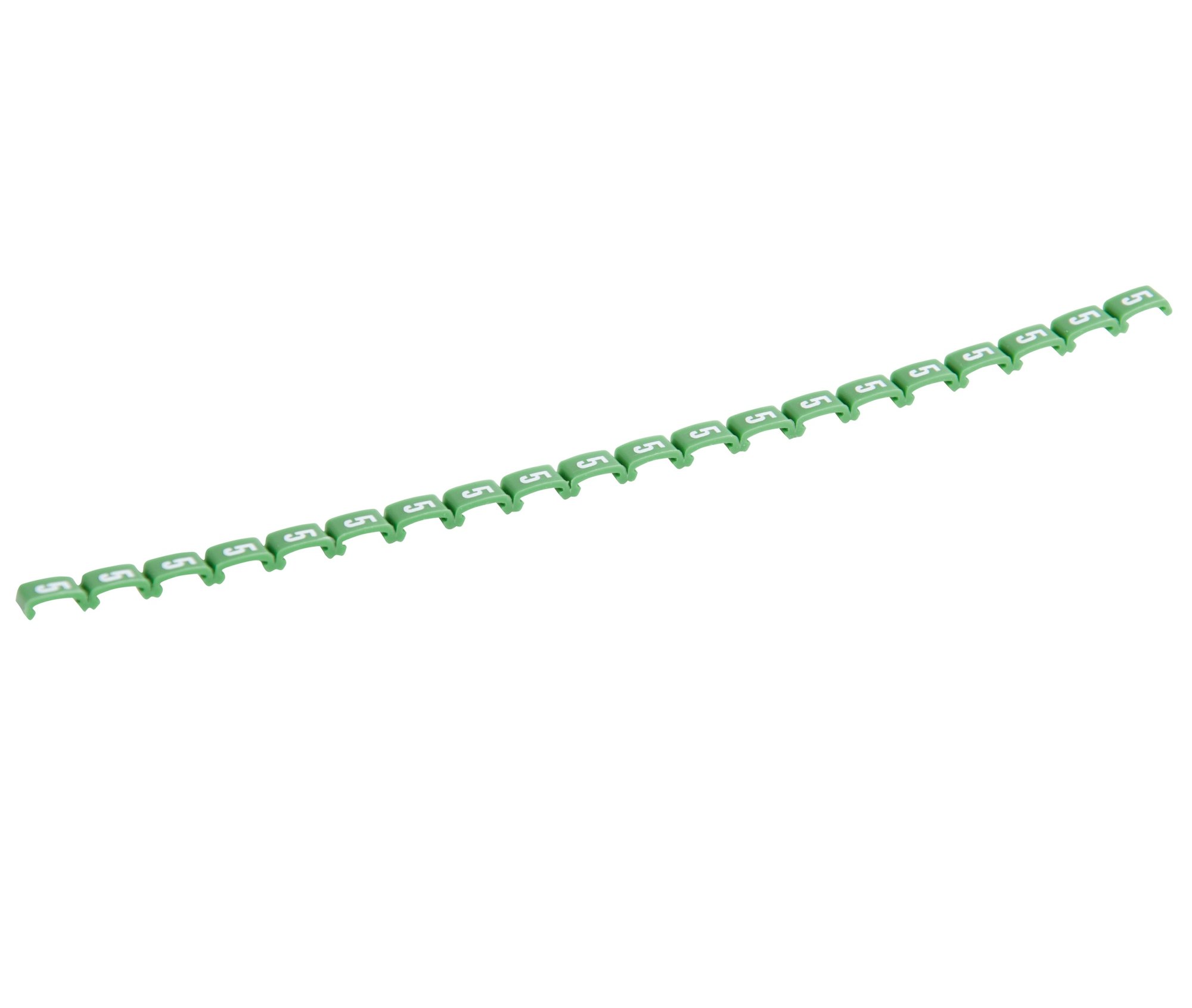 Kabelopmærkningssystem med mærker med tallet 5. Farven er grøn ifølge international farvekode.
