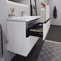 Møbelsættet er udført i en smuk hvid glans finish, som tilfører et lyst og moderne udtryk til ethvert badeværelse. De integrerede greb sikrer et minimalistisk design, der er let at vedligeholde.