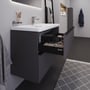 Møbelsættet er udført i en flot mat grafit farve, som giver et sofistikeret og nutidigt præg til ethvert badeværelse. Skufferne er udstyret med integrerede greb, der bidrager til et minimalistisk og strømlinet udseende. Den melaminbelagte overflade sikrer en slidstærk og let rengørlig finish, der kan modstå hverdagens brug.