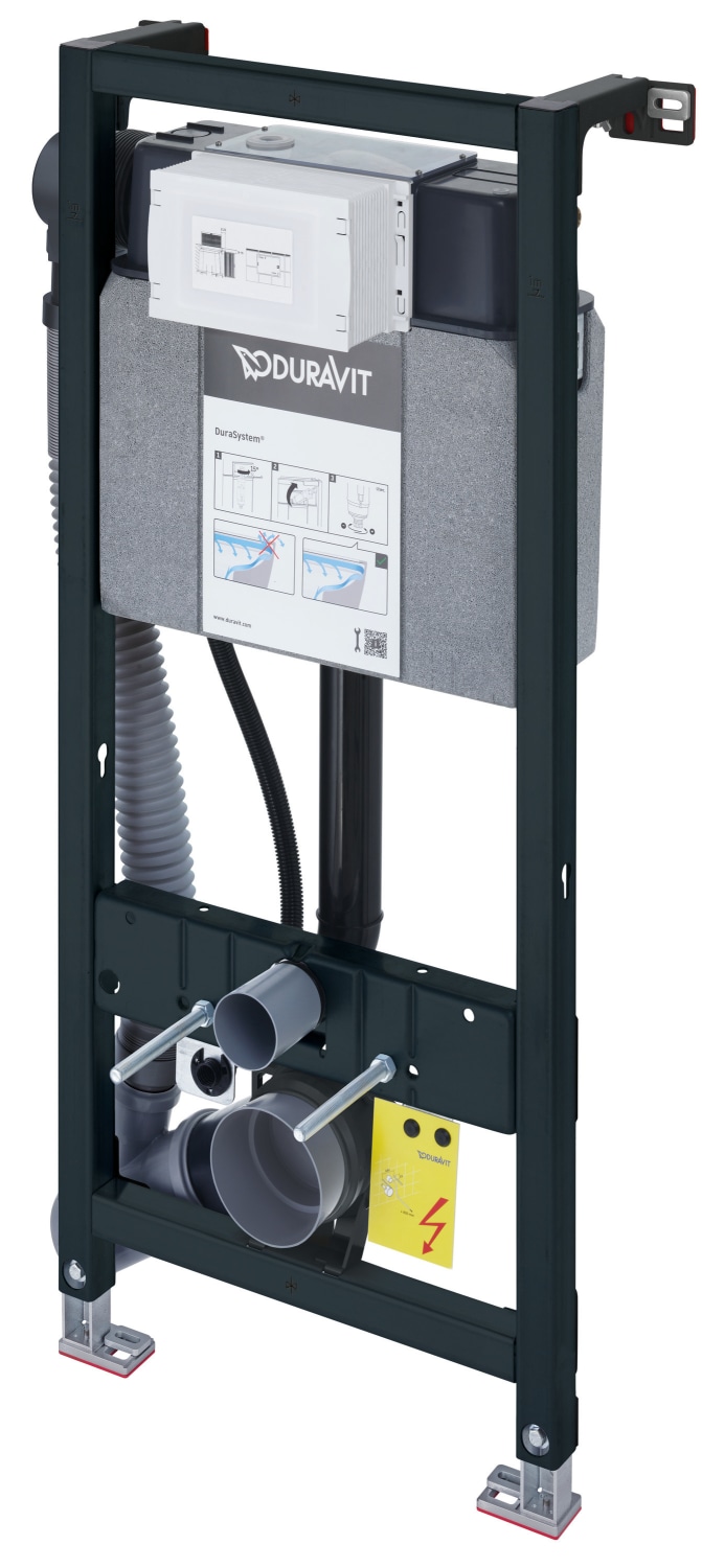 Sort indbygningscisterne fra Duravit med integreret lugtudsugning. Den måler 500x155x1148 mm og er frontbetjent.