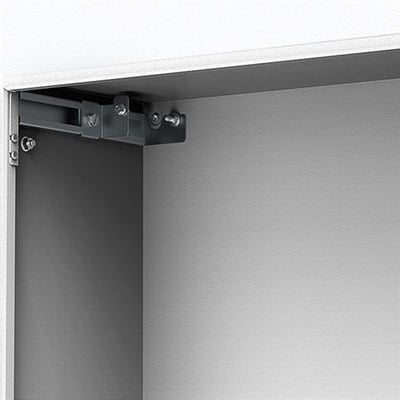 Beslag til dybdejustering af monteringsplader, 19" profiler og indvendige døre. Til rustfrie skabe kræves bearbejdning.