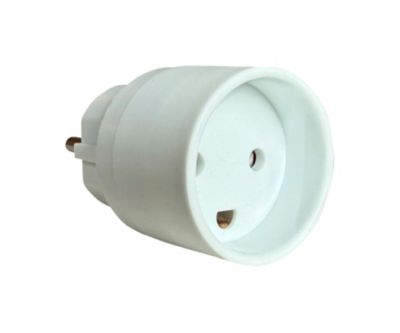 Adapter fra Schuko/Pind-jord til Dansk jordforbindelse. Hvid, 250V, 16A. IP20-klassificeret.