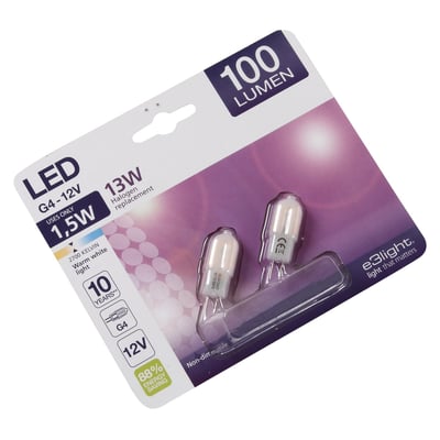 LED G4 pæren har en lysstyrke på 120lm* og bruger 1,5W, hvilket erstatter 13W halogenbelysning.