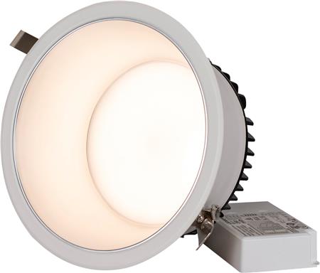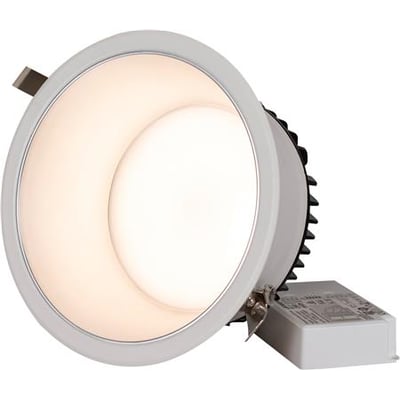 Med DIP-switchen kan lysmængden justeres, og farvetemperaturen vælges mellem 3.000 K, 4.000 K og 5.700 K. Armaturet leveres komplet med en ekstern driver, der understøtter fasedæmpning eller DALI-styring via trykklemmer. Det er desuden udstyret med skruefri trækaflastning for nem og sikker installation. En dækkring findes som tilbehør.