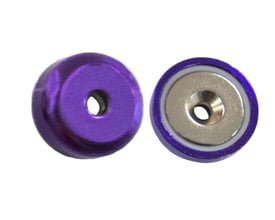 Pottemagnet med forsænket hul til skruehoved. Fås i forskellige farver. Diameter: 48 mm. Hulstørrelse: Ø 8,5 mm. Materiale: Neodymium. Passer til skrue M8. Trækkraft: 75 kg.