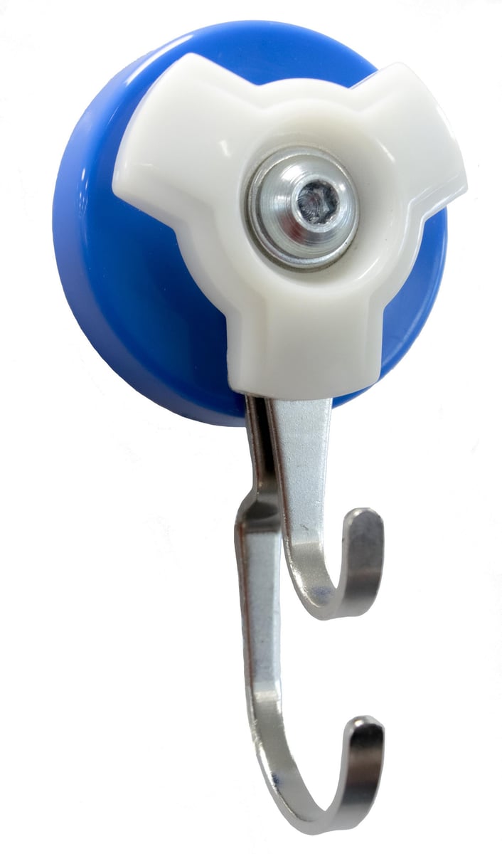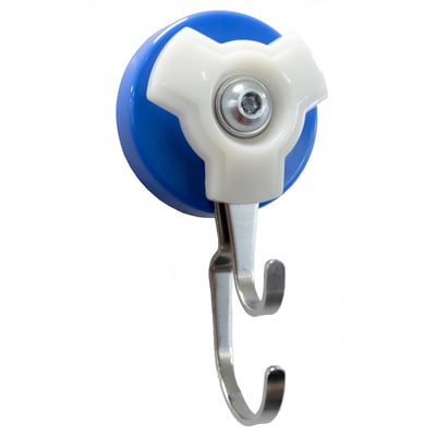 Den blå plastkappe beskytter magneten og giver et pænt udseende. Den låsbare krogposition sikrer, at emnerne hænger sikkert.