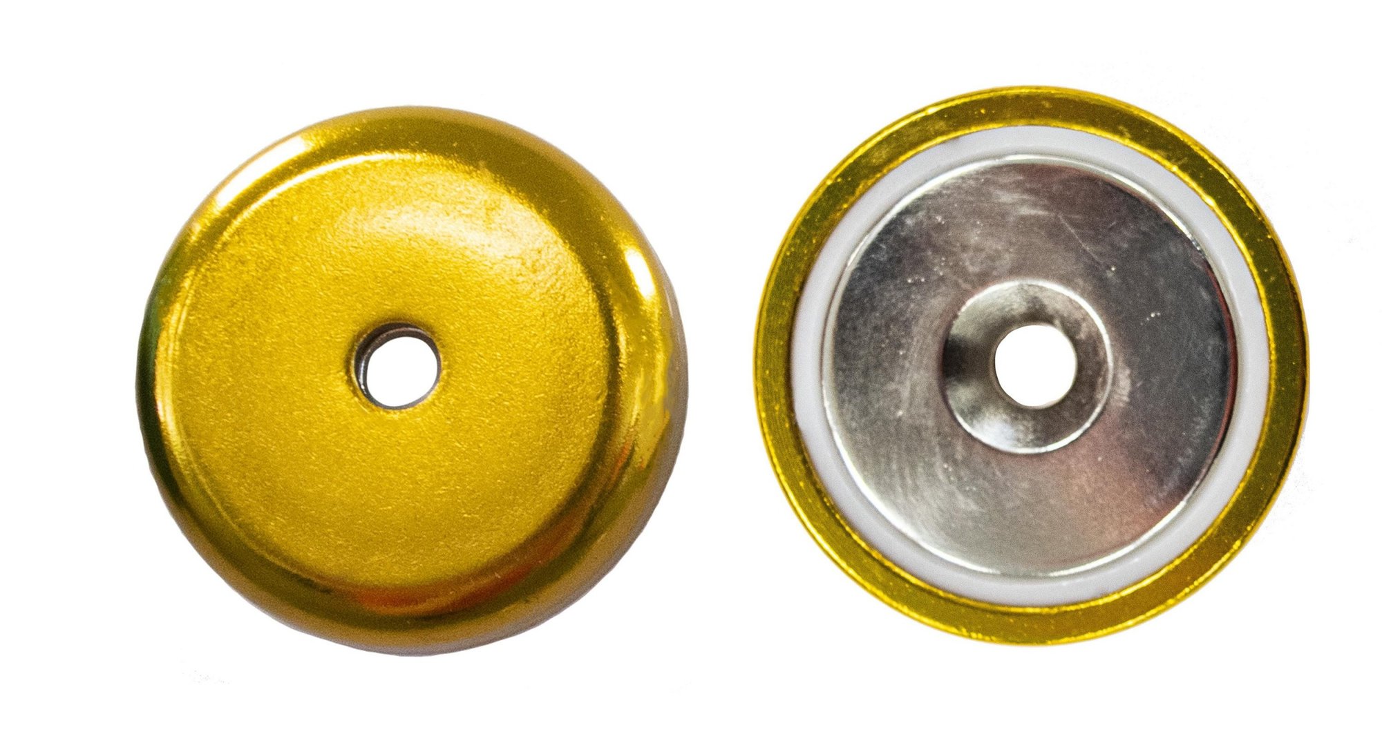 Eclipse guld neodymium pottemagnet med forsænket hul til skruehoved. Fås i forskellige farver. Diameter: 16 mm. Hulstørrelse: Ø 3,5 mm. Materiale: Neodymium. Pakke med 10 stk.