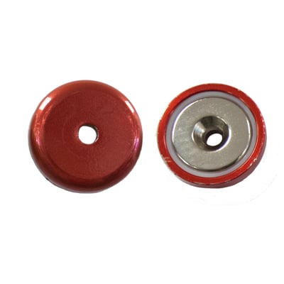Rød neodymium pottemagnet med forsænket hul til skruehoved. Perfekt til diverse miljøer. Dimensioner: Ø32x8mm, hulstørrelse Ø5,5mm. Passer til M5 skruer. Pakke med 10 stk.